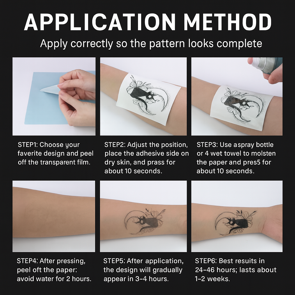 4. Slowly peel away the backing from your skin, allowing the tattoo to air dry untouched for at least 10 seconds. After it dries, the tattoo should feel smooth and will remain vibrant for 2 to 5 days.